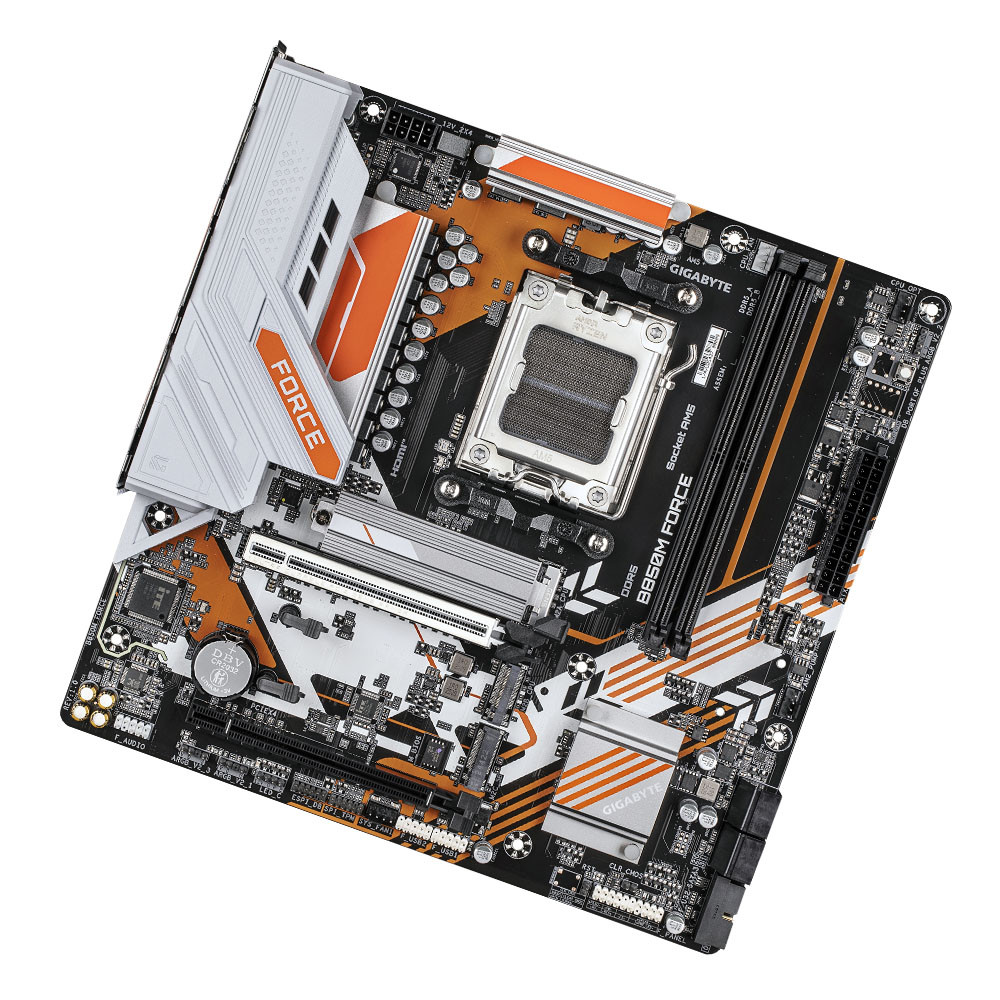 Bo mạch chủ sử dụng socket AMD AM5, tương thích với các dòng Ryzen thế hệ mới. Với 2 khe RAM DDR5 hỗ trợ tối đa 128GB, Gigabyte B850M Force Wifi 6E DDR5 tập trung vào hiệu năng và độ ổn định khi chạy bộ nhớ xung cao.