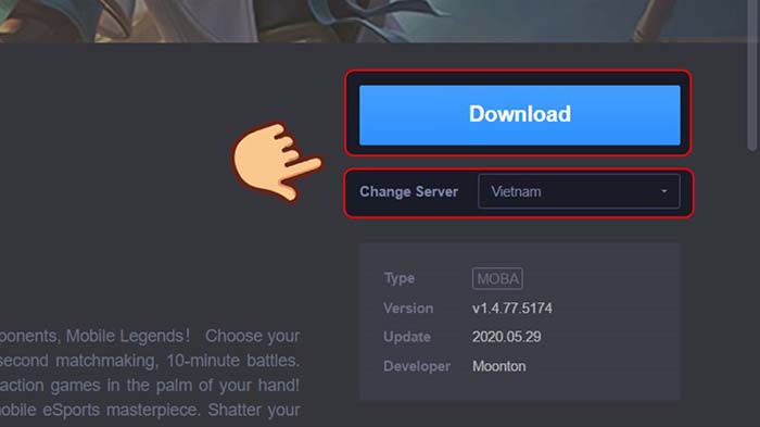 Tải GameLoop về máy > Vào GameLoop > Nhập Mobile Legends tại ô tìm kiếm > Chọn server Vietnam > Chọn Download.
