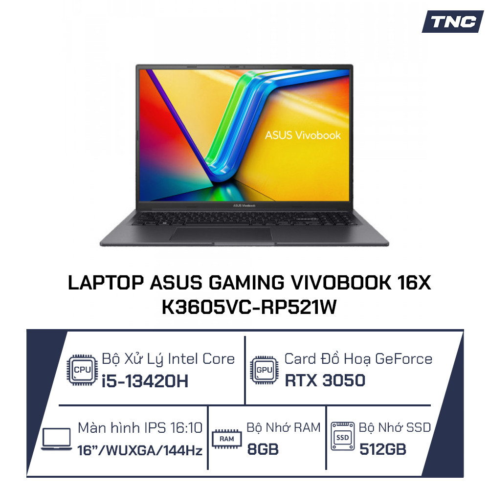 Laptop Asus Gaming Vivobook K3605VC-RP521W là mẫu máy tính xách tay cân bằng giữa hiệu năng và tính tiện dụng. Thiết kế hiện đại, màn hình 144Hz mượt mà và GPU rời RTX 3050 giúp mang lại trải nghiệm tốt cho cả làm việc lẫn giải trí. Đây là lựa chọn phù hợp cho sinh viên, dân văn phòng hoặc game thủ phổ thông đang tìm kiếm một chiếc laptop gaming bền bỉ và có mức giá hợp lý tại TNC Store.
