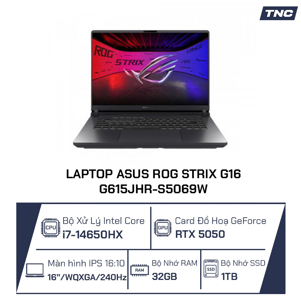 Laptop Asus ROG Strix G16 G615JHR-S5069W là mẫu laptop gaming tầm trung thuộc dòng ROG Strix mới, kết hợp giữa thiết kế hầm hố, màn hình Nebula Display cao cấp và hiệu năng mạnh mẽ từ CPU Intel Core i7 thế hệ 14. Với card đồ họa RTX 5050, máy đáp ứng tốt nhu cầu chiến game eSports, giải trí đa phương tiện và làm việc sáng tạo.
