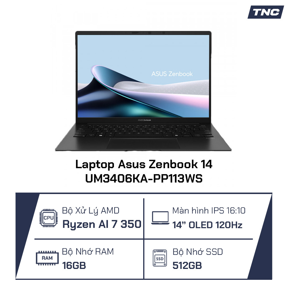 Laptop Asus Zenbook 14 UM3406KA-PP113WS là chiếc ultrabook hội tụ đủ yếu tố: thiết kế sang trọng, hiệu năng mạnh mẽ, màn hình OLED chuẩn màu và tính di động cao. Đây sẽ là lựa chọn tuyệt vời cho người dùng cần một chiếc máy vừa để làm việc, vừa để tận hưởng giải trí chất lượng cao. Sản phẩm hiện đã có mặt tại TNC Store với chế độ bảo hành chính hãng, sẵn sàng đồng hành cùng bạn trong công việc và cuộc sống.