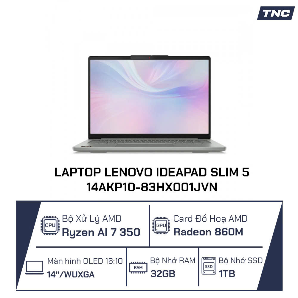 Lenovo IdeaPad Slim 5 14AKP10 là chiếc laptop lý tưởng cho học sinh, sinh viên, dân văn phòng và người dùng sáng tạo muốn một thiết bị mỏng nhẹ nhưng cực mạnh. Màn OLED tuyệt đẹp, 32GB RAM, 1TB SSD và sức mạnh từ Ryzen AI 7 giúp chiếc máy này nổi bật hơn hẳn so với các đối thủ cùng tầm giá. Nếu bạn đang tìm laptop toàn diện, bền, đẹp và mượt trong mọi tác vụ, đây là lựa chọn không nên bỏ qua. Bạn có thể mua Lenovo IdeaPad Slim 5 chính hãng với giá tốt nhất tại TNC Store ngay hôm nay.