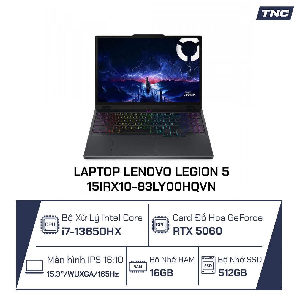 Lenovo Legion 5 15IRX10 với i7-13650HX, RTX 5060 và màn hình 165Hz là chiếc laptop gaming có hiệu năng mạnh, độ bền tốt và màn hình mượt mà khó có đối thủ trong phân khúc. Đây là lựa chọn lý tưởng cho game thủ, sinh viên IT, người làm video hoặc bất kỳ ai cần một chiếc máy mạnh mẽ, ổn định lâu dài. Nếu bạn muốn sở hữu chiếc Laptop chất lượng cùng mức giá tốt nhất, hãy ghé ngay TNC Store để nhận ưu đãi hấp dẫn và dịch vụ hỗ trợ tận tâm.