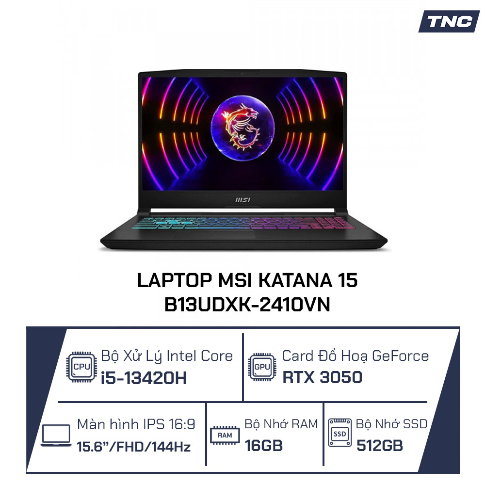 MSI Katana 15 B13UDXK-2410VN là lựa chọn đáng giá cho game thủ và người dùng cần một chiếc laptop hiệu năng mạnh, màn hình 144Hz mượt mà và thiết kế gaming cá tính. Sở hữu ngay sản phẩm này chính hãng tại TNC Store để trải nghiệm sức mạnh vượt trội, giá ưu đãi cùng dịch vụ bảo hành uy tín nhé.