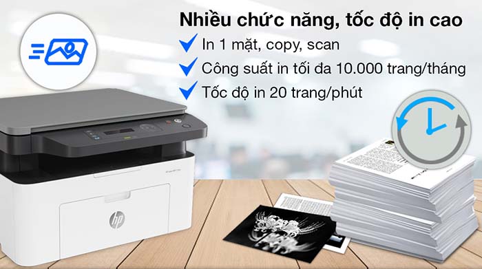 Máy in laser trắng đen MFP 135A 4ZB82A cài đặt chức năng in 1 mặt, copy, scan, cho phép bạn in, sao, quét tài liệu linh hoạt tùy theo nhu cầu.