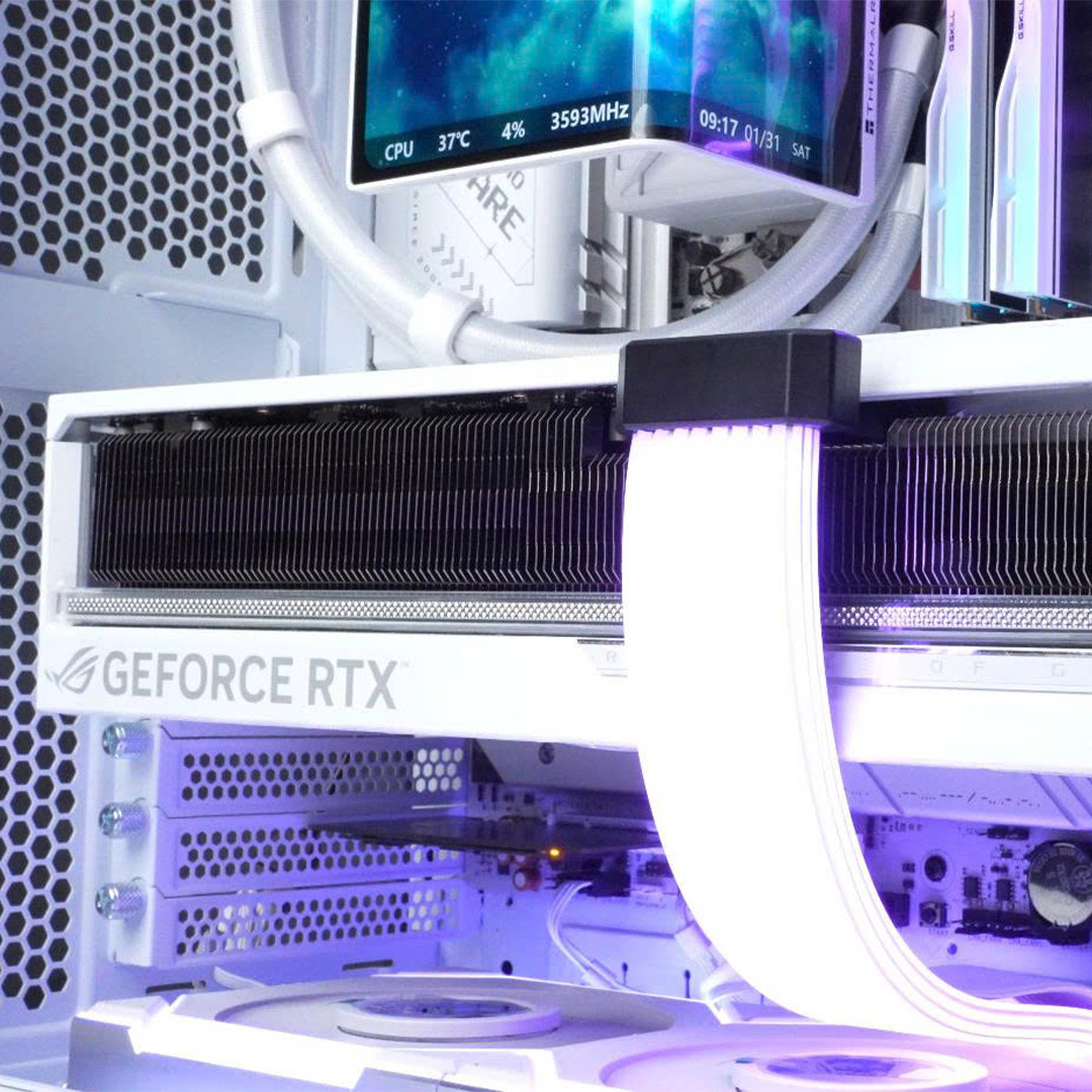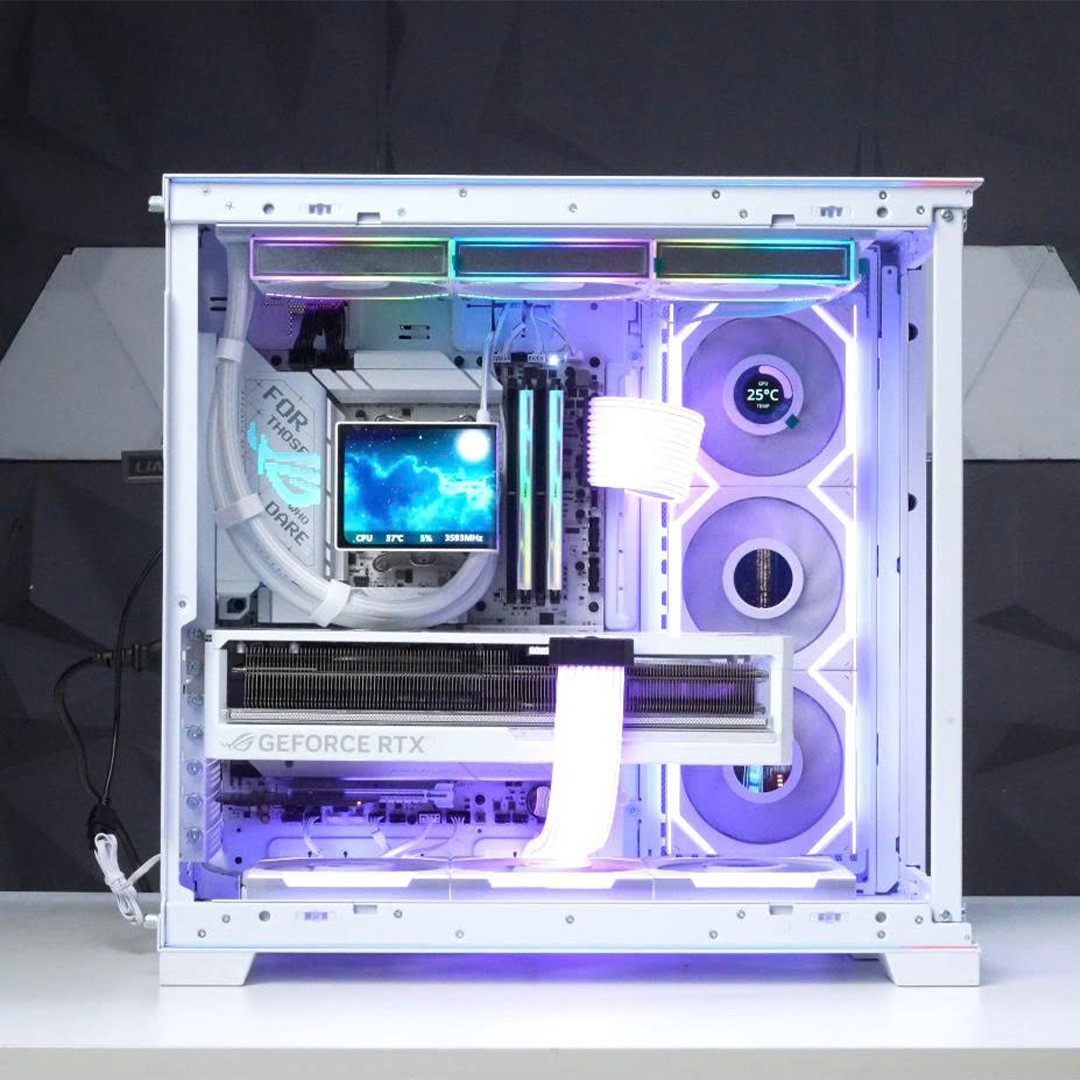Thiết kế tông trắng đặc trưng của dòng STRIX cũng giúp tổng thể bộ PC đồng bộ với linh kiện và case, phù hợp cho những setup gaming cao cấp hoặc không gian làm việc hiện đại.