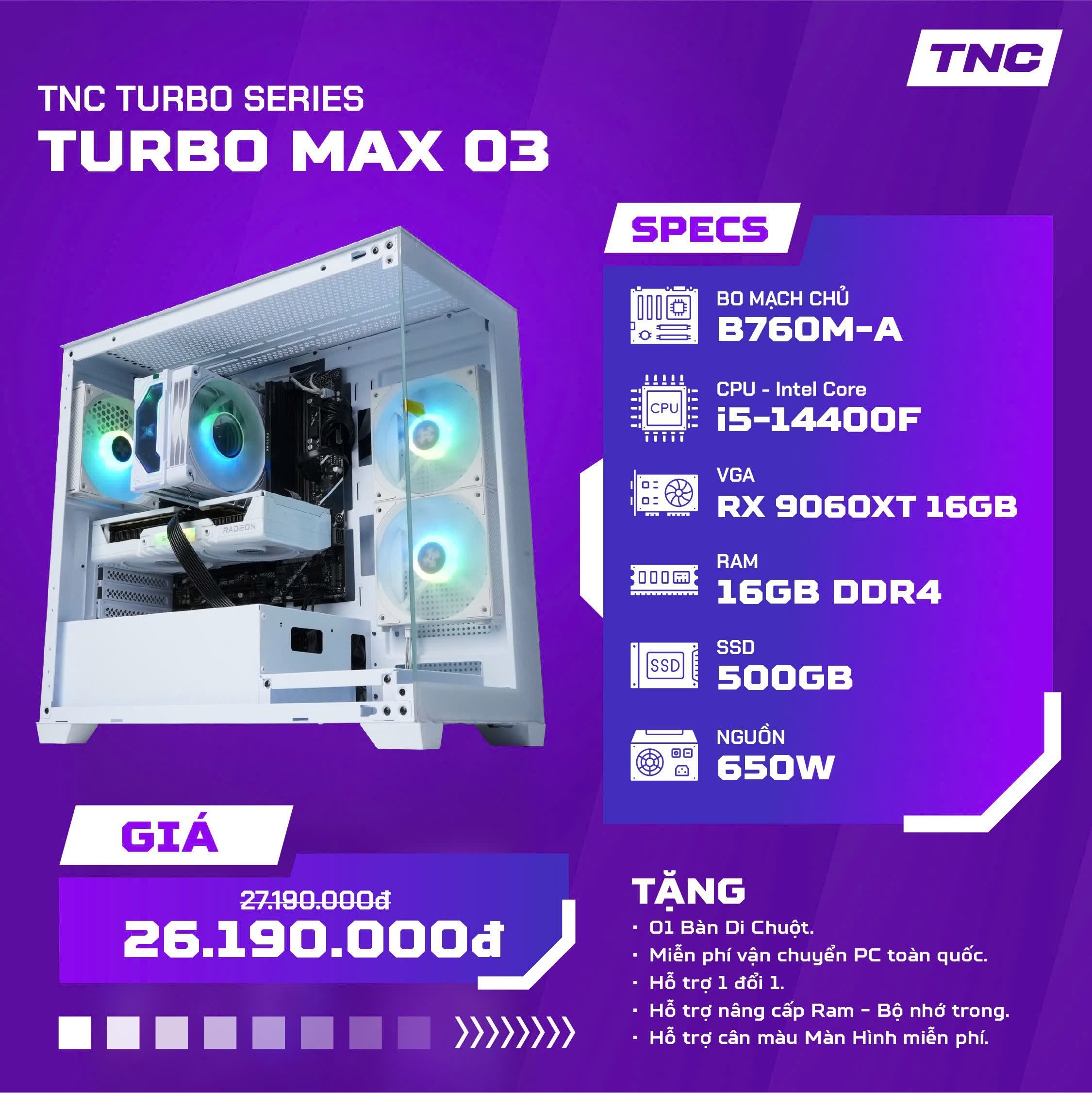 PC Gaming TNC Turbo Max - 03 là cấu hình thiết kế cho game thủ muốn sức mạnh vượt trội trong phân khúc tầm trung – cao mà vẫn giữ chi phí hợp lý. Với CPU Intel Core i5-14400F, GPU Radeon RX 9060 XT 16GB, RAM 16GB và SSD NVMe tốc độ cao, Turbo Max - 03 mang đến trải nghiệm chiến game Full HD/2K cực mượt, xử lý đa nhiệm ổn định và có khả năng nâng cấp lâu dài.