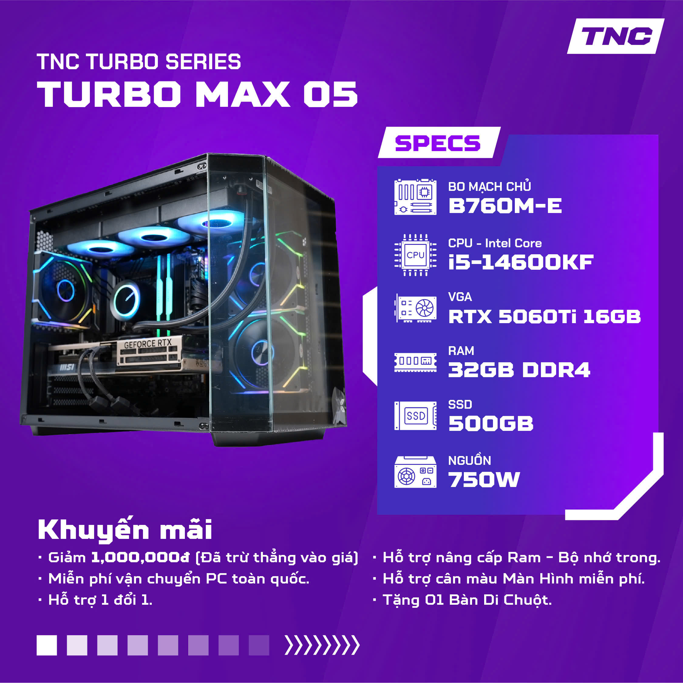 PC Gaming TNC Turbo Max - 05 là cấu hình đáng cân nhắc cho game thủ cần một bộ PC mạnh - ổn định - dễ nâng cấp, đủ sức đáp ứng tốt các tựa game hiện tại và tương lai gần. Sự kết hợp giữa i5-14600KF và RTX 5060Ti 16GB mang lại trải nghiệm mượt mà, lâu dài và đáng tin cậy. Nếu bạn đang tìm kiếm một bộ PC gaming tối ưu trong tầm giá, TNC Turbo Max – 05 chắc chắn là lựa chọn rất đáng để đầu tư tại TNC Store.