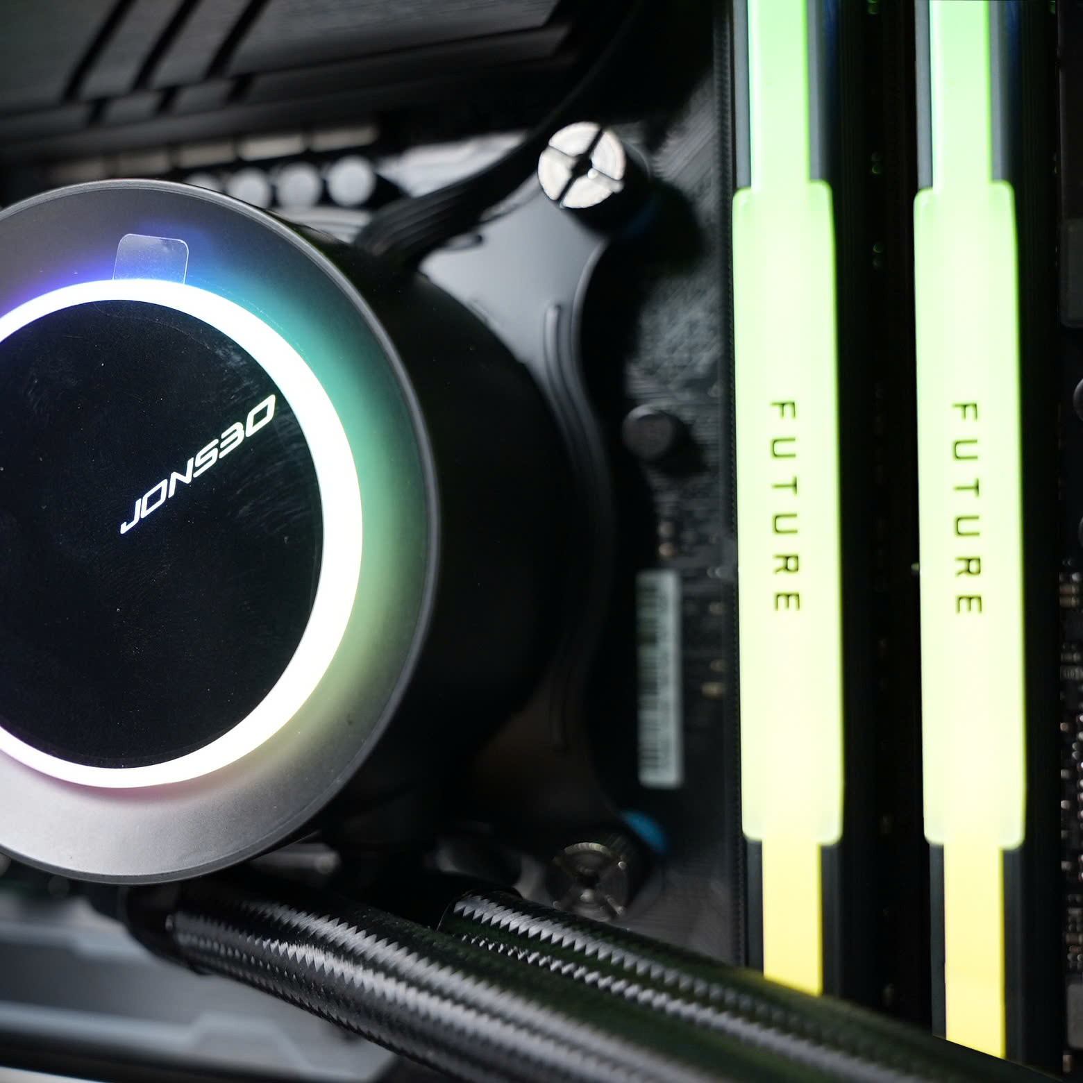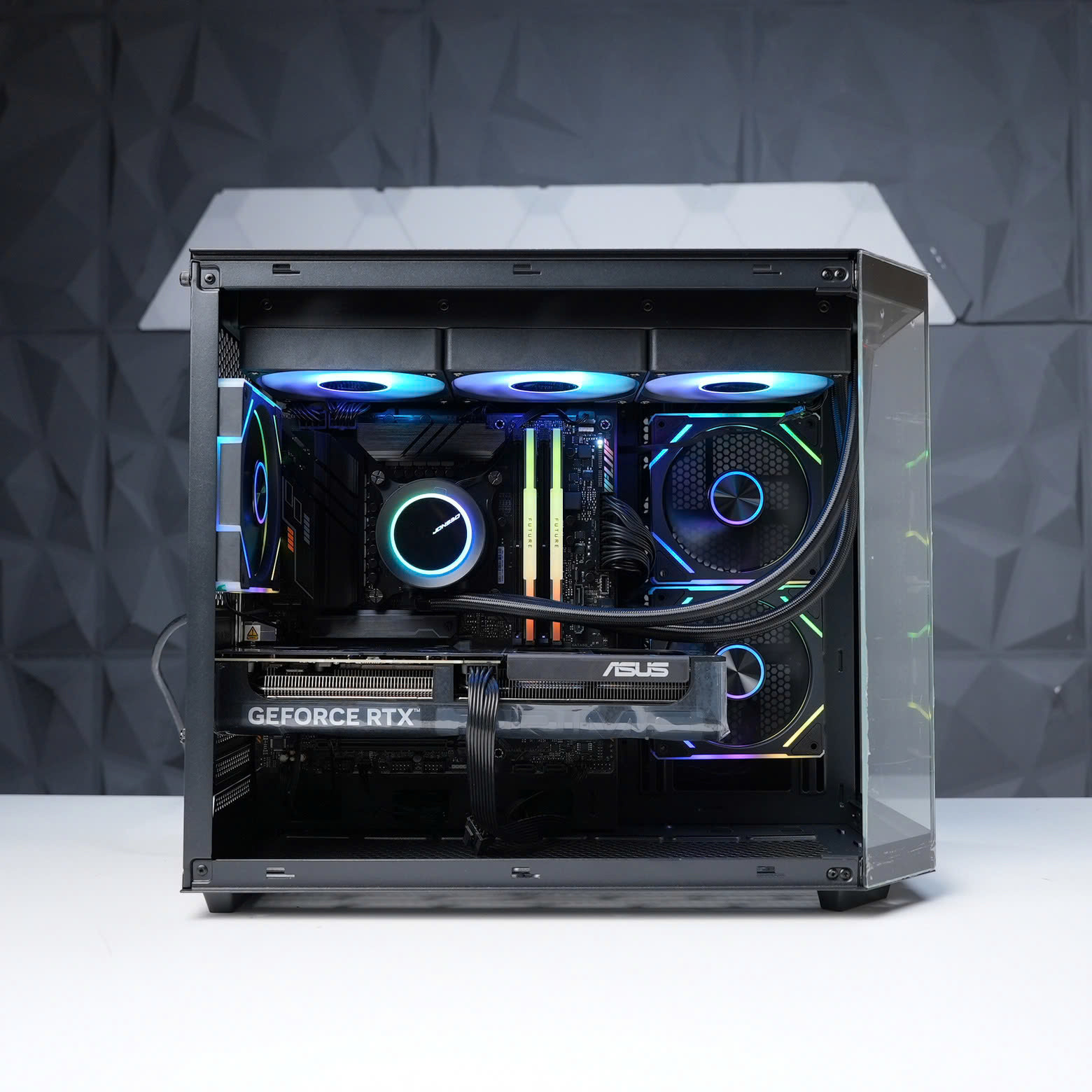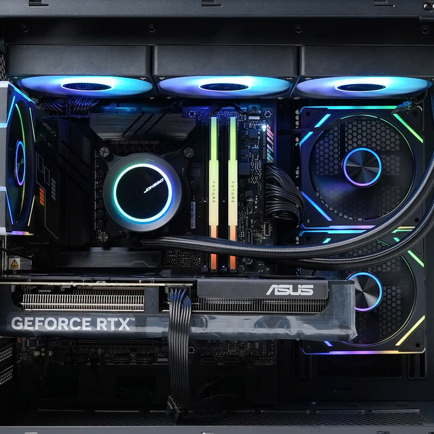 Hệ thống được trang bị tản nhiệt nước Jonsbo TG-360 ARGB Black kết hợp cùng 3 quạt Magic Snowman F-125 ARGB, đảm bảo khả năng làm mát hiệu quả cho CPU i5-14600KF. Không gian trong case Xigmatek Cubi M Black được tối ưu luồng gió tốt, vừa giữ nhiệt độ ổn định vừa mang lại vẻ ngoài gọn gàng, hiện đại.