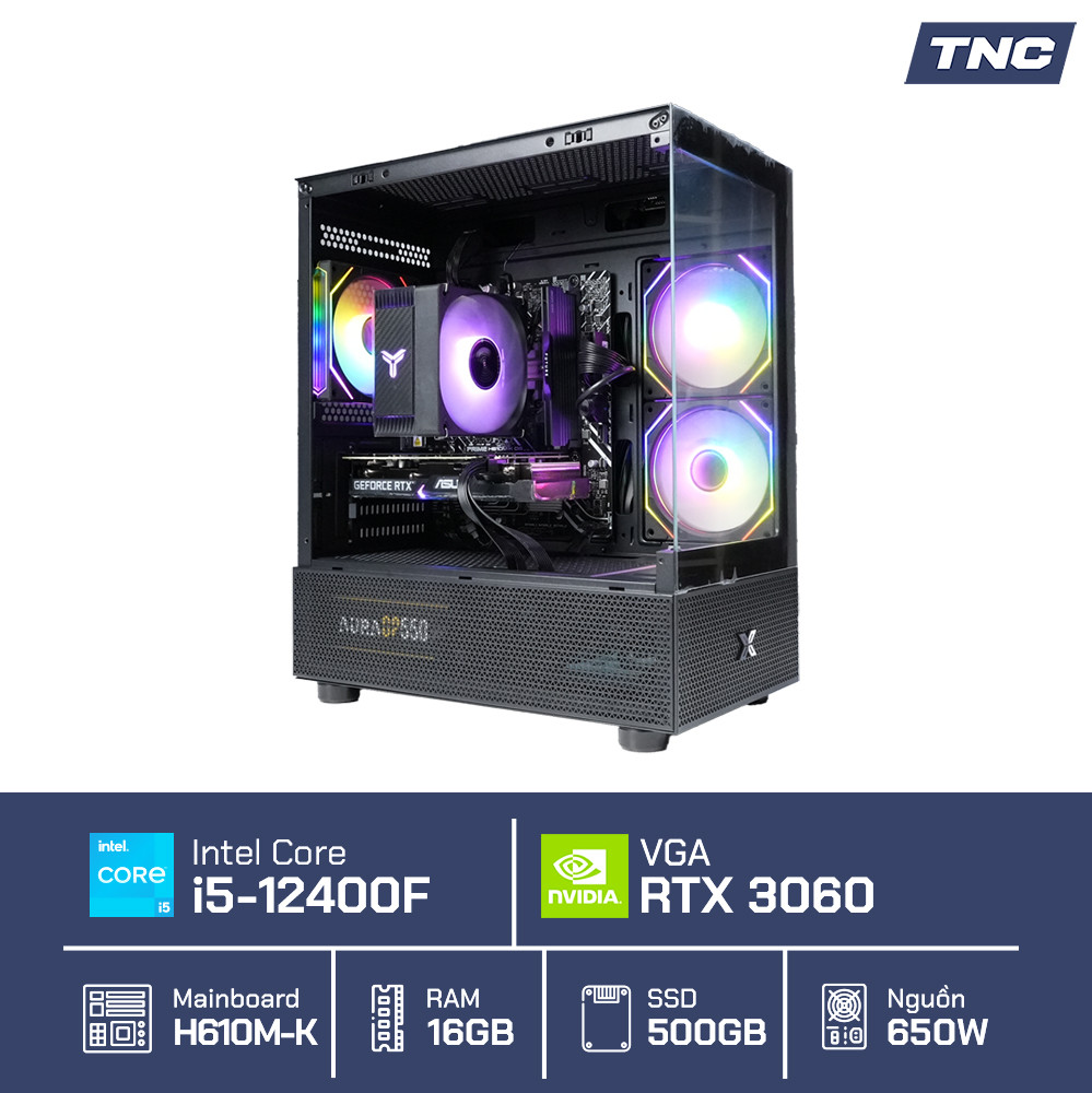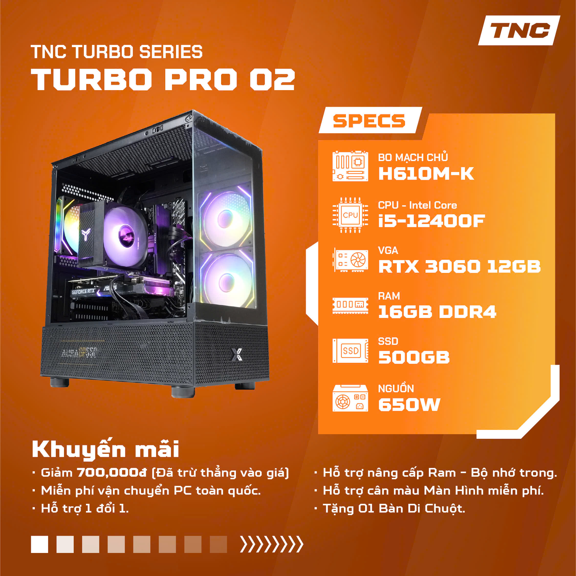 PC Gaming TNC Turbo Pro - 02 là cấu hình cân đối trong phân khúc tầm trung, nhắm đến game thủ muốn trải nghiệm chơi game mượt mà ở độ phân giải Full HD/2K, xử lý đa nhiệm ổn định và đầy đủ kết nối để phục vụ học tập, làm việc, giải trí và livestream cơ bản. Sự kết hợp giữa Intel Core i5-12400F, RTX 3060 12GB cùng SSD NVMe 500GB giúp Turbo Pro – 02 mang lại hiệu năng ấn tượng trong tầm giá.