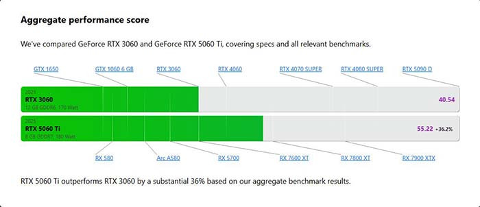 Trong các bài kiểm tra thực tế, RTX 5060 Ti vượt trội hơn RTX 3060 khoảng 30–45% về hiệu năng, đặc biệt khi chơi game ở độ phân giải 1440p. RTX 5060 Ti hỗ trợ DLSS 4 và Multi Frame Generation, giúp tăng tốc độ khung hình vượt trội, trong khi RTX 3060 chỉ có DLSS 2. Các tựa game như Cyberpunk 2077 và Red Dead Redemption 2 chứng minh sự chênh lệch này rõ rệt.