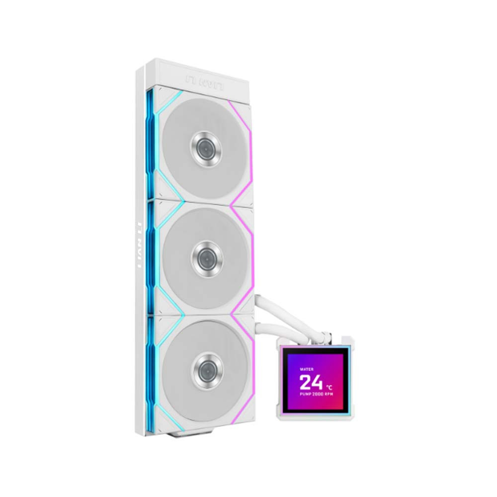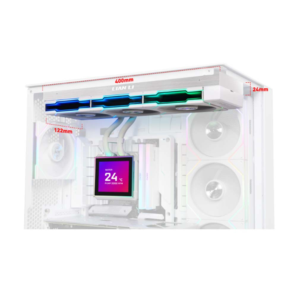 Ba chiếc quạt không dây 120mm (124 x 120 x 28mm) được điều khiển độc lập với tốc độ từ 200 đến 2600RPM, áp suất tĩnh lên tới 3.97 mmH2O và lưu lượng gió 90.1 CFM giúp tản nhiệt nhanh chóng. Dù hiệu suất cao, độ ồn vẫn được kiểm soát ở mức hợp lý, chỉ khoảng 33 dBA. Radiator kích thước lớn 400 x 122 x 24mm làm từ hợp kim nhôm cao cấp cho khả năng tản nhiệt hiệu quả hơn các mẫu thông thường.